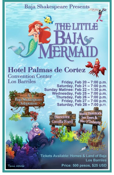 - Tickets on sale! Baja Shakespeare is proud to present The Little Baja Mermaid. The show opens Feb 20 for seven performances at Palmas de Cortez. Get your tix at Homes & Land of Baja. 10-4 M-F, 10-2 Sat. Click for dates, times, and tickets